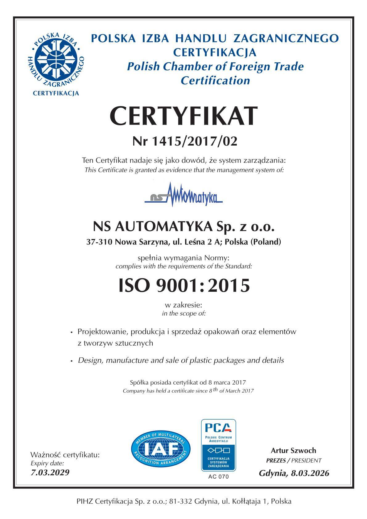 W trosce o naszych Klientów wdrożyliśmy system zapewnienia jakości zgodny z międzynarodowymi normami ISO 9001:2015.